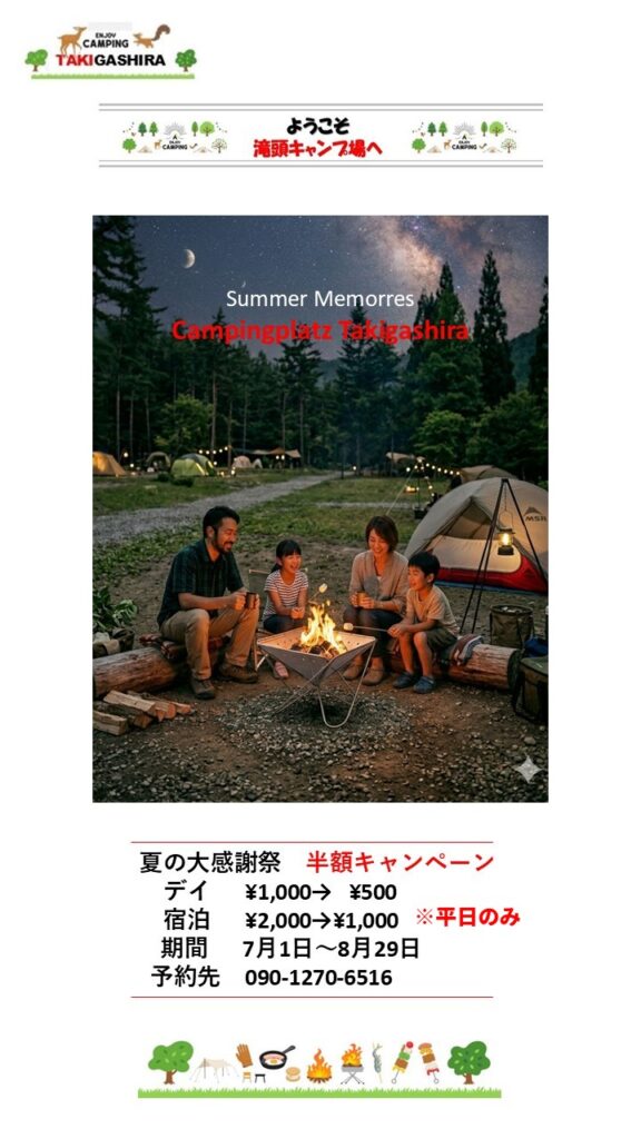 | キャンプ場受付 | TEL 090-1270-6516 |